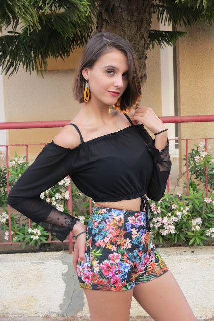 I styled this beaaaaaautiful off-the-shoulder bell sleeved boho top that I picked out from DressLink. I decided to stay with the whole black theme but went for some shorts that were colorful but with a black base. I also went for a pop of color with the adorable yellow rope earrings. This is just an everyday summer outfit for me and embodies my summer style; sexy, bohemian and free-flowing.